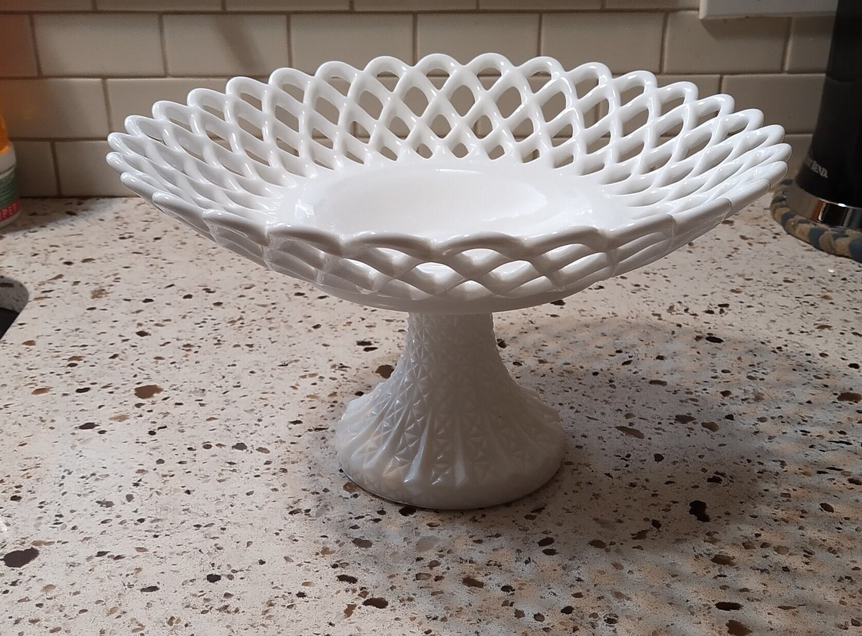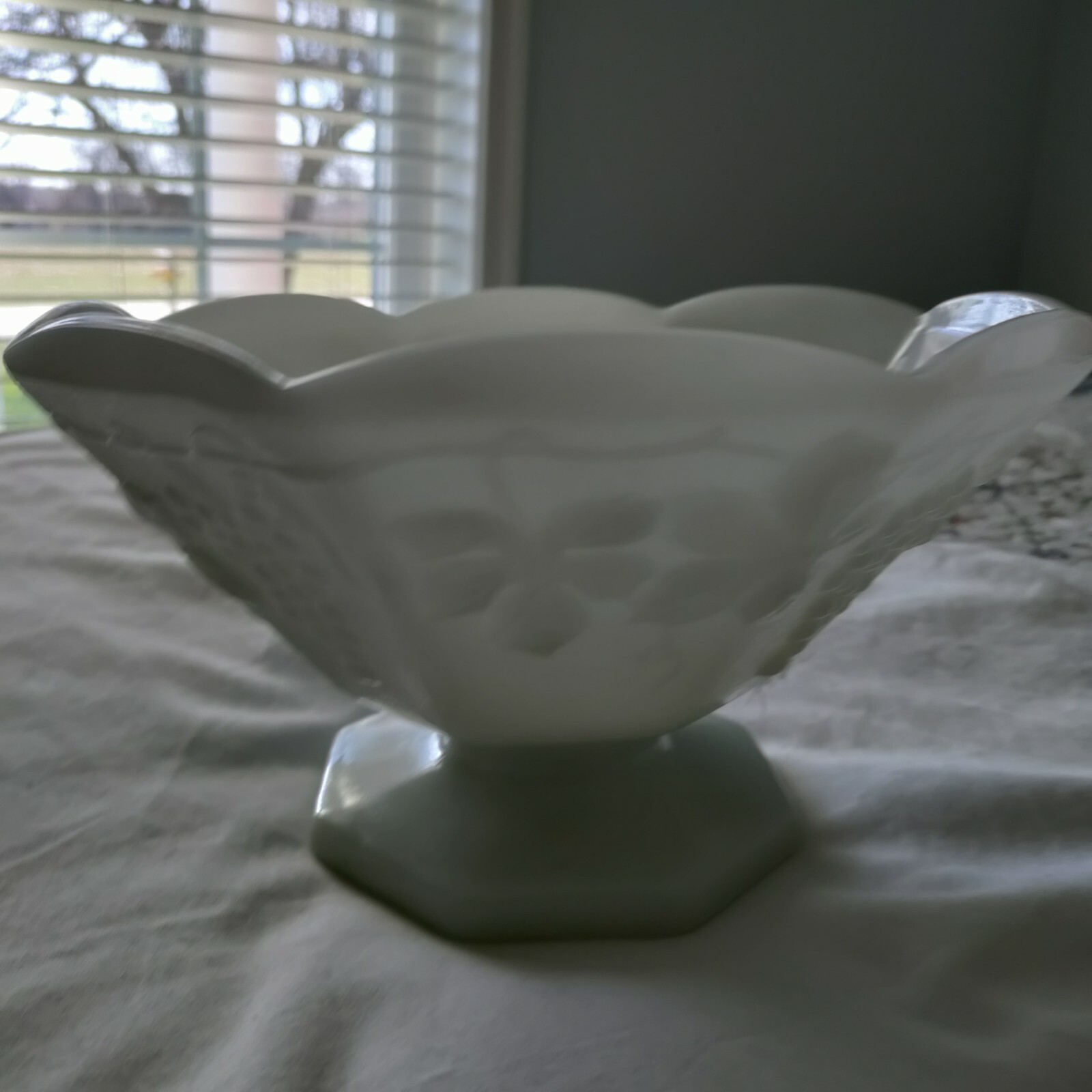 Vintage White Milk Glass Pedestal Fruit Bowl With Grape Vine Design Signastyle