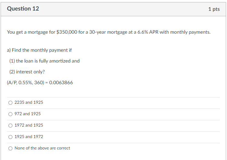 Solved Question 12 1 Pts You Get A Mortgage For 350 000 For Chegg Com
