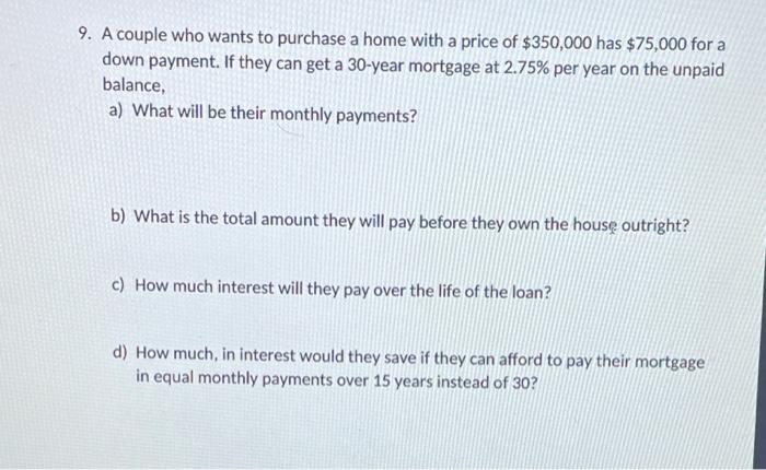 Solved 9 A Couple Who Wants To Purchase A Home With A Price Chegg Com